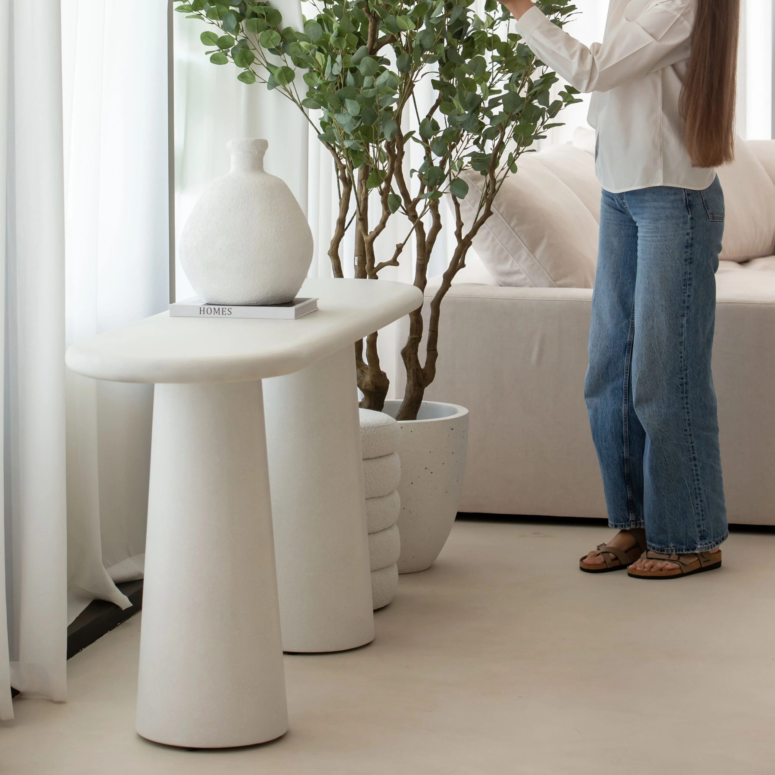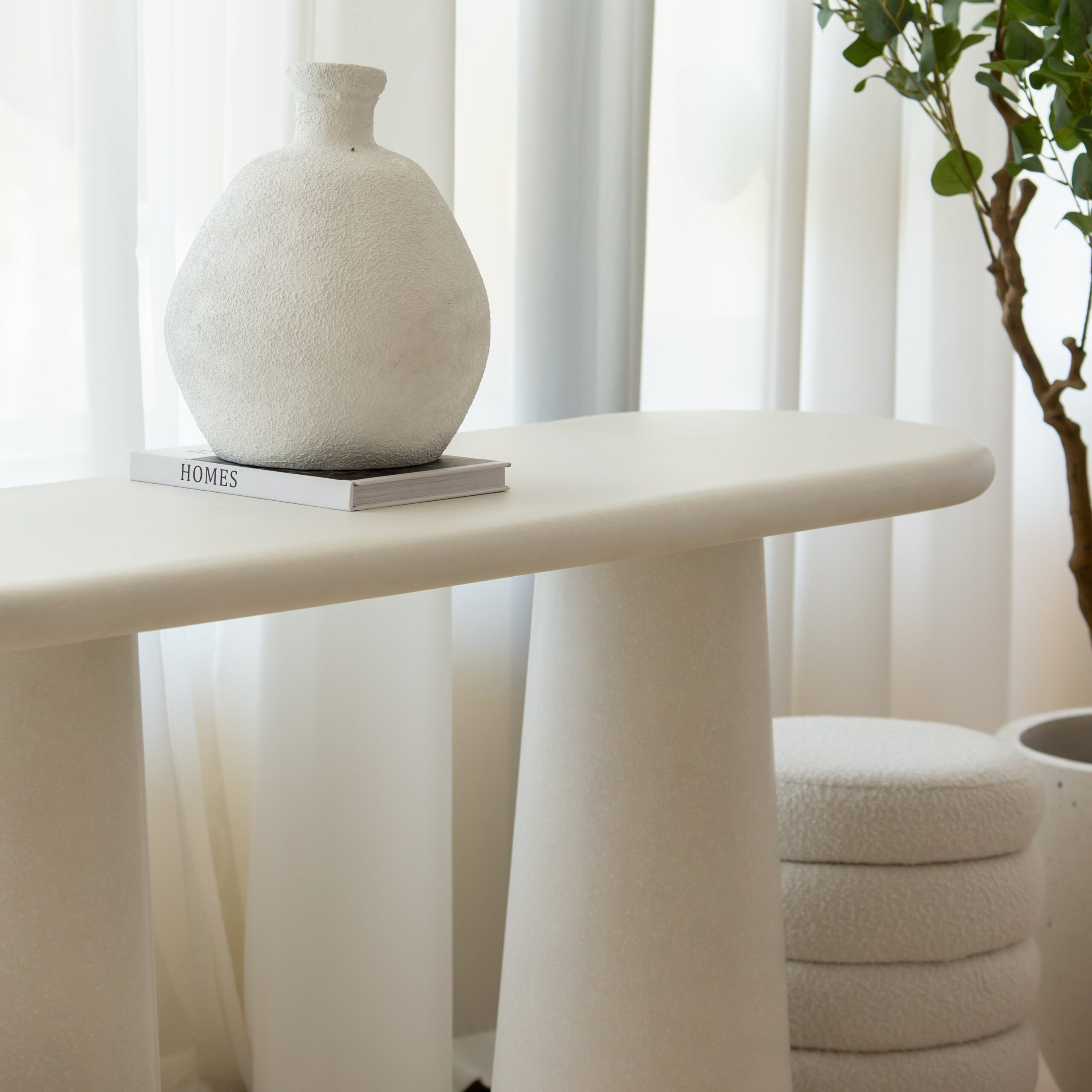 The Elara Console Table features a distinctive silhouette defined by a softly rounded tabletop resting on a pair of elegant, solid column bases. Its balanced proportions and clean structural lines create a sophisticated visual profile that enhances hallways, entryways, living rooms, and curated display corners. The crisp matte white concrete finish exudes a sense of freshness and purity, blending seamlessly with interiors ranging from minimalist and Mediterranean to modern luxury and Japandi-inspired settings.
