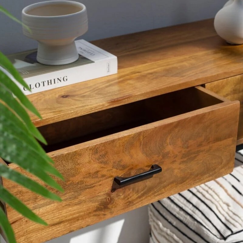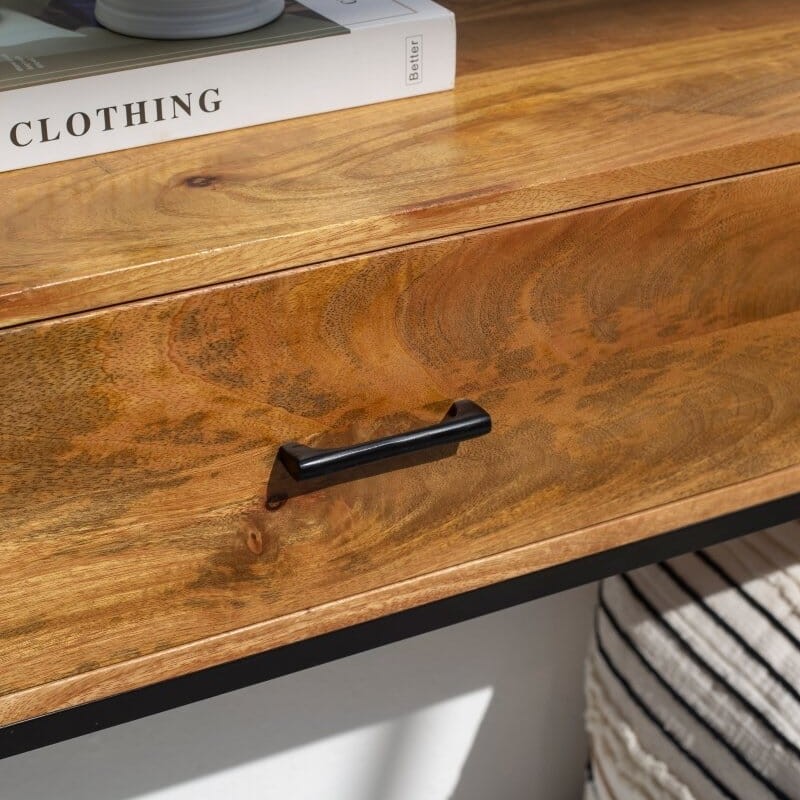 Introduce a refined blend of industrial style and natural charm to your home with the Vandana Sierra Neo – Mango Wood 2-Drawer Console Table. Thoughtfully designed to elevate modern interiors, this console table brings together the organic warmth of mango wood with the sleek strength of black metal legs, creating a perfect harmony of rustic elegance and contemporary edge. Whether placed in an entryway, hallway, or living room, it enhances your space with its bold yet refined presence.