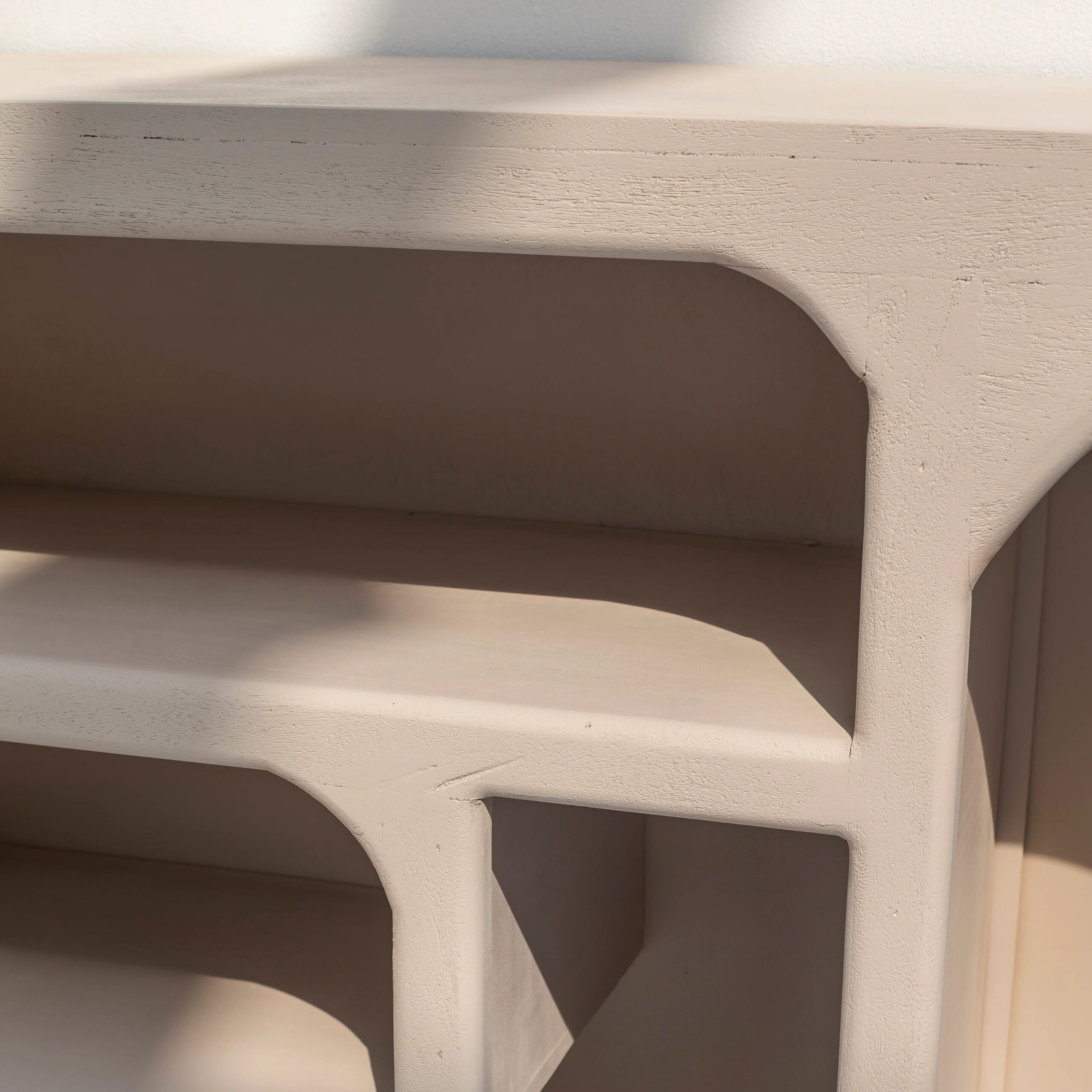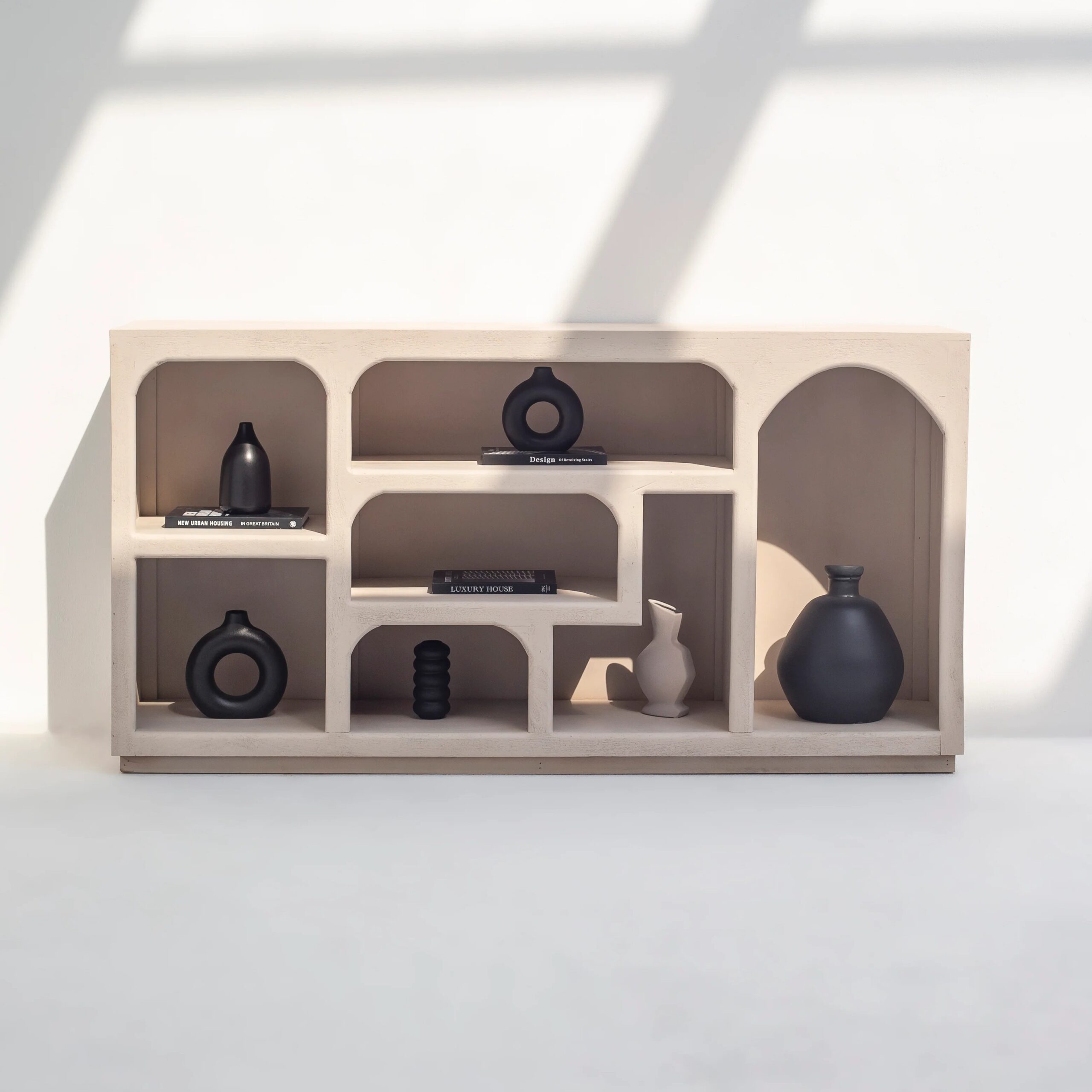The soft, neutral-toned painted finish adds understated refinement, allowing the console to harmonize beautifully with a wide range of décor themes—whether warm earthy palettes, monochrome aesthetics, or Scandinavian-inspired spaces. Each shelf is thoughtfully arranged to provide ample room for displaying books, statement vases, sculptures, candles, or curated art pieces, making it an ideal focal point in living rooms, dining areas, hallways, or studio spaces.